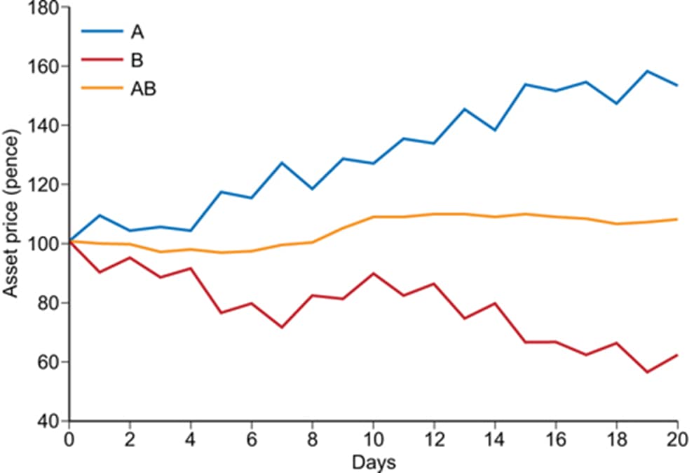 - For example, take two assets whose prices go in the opposite direction every day but on average are on a downward trend month after month: